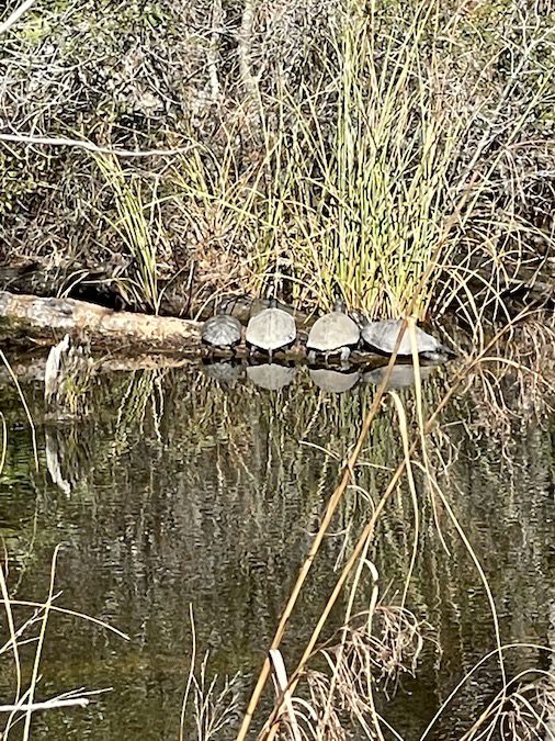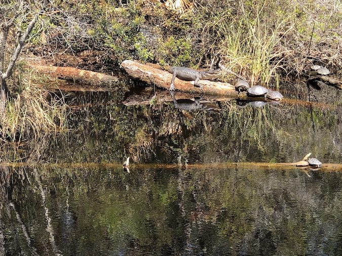 I have been there many times and some of the photos of alligators are below for you to see. My wife and I are not sure if it’s the same alligator or if the one we see is part of a family. The alligator is usually sunbathing and as mentioned often has turtles as company.