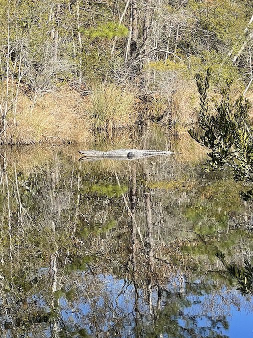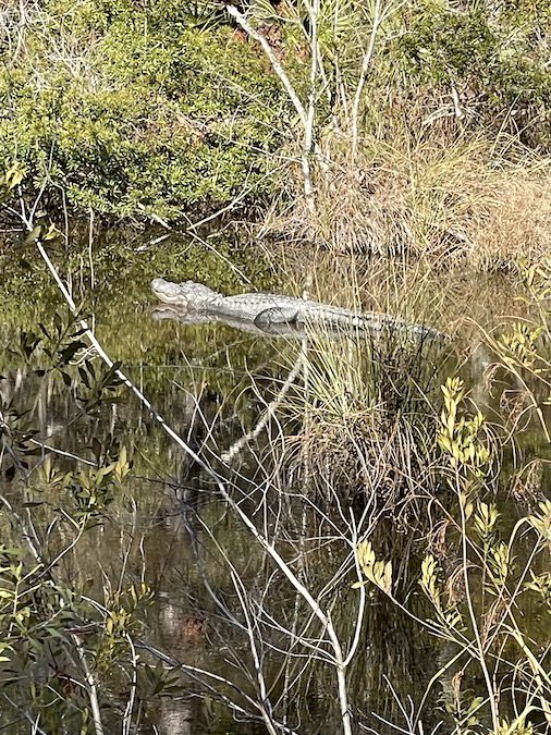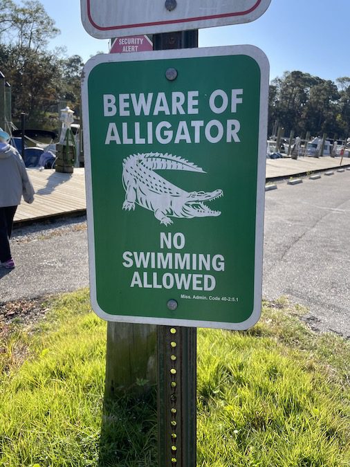 Alligators are not just found in Florida.  The Mississippi Gulf Coast has a large healthy population.  Unlike Florida however, Alligators don’t usually knock at the door waiting to be let in.  Alligators in Mississippi generally do not swim in your pool.  You have to go out of your way to see an Alligator in Mississippi unless you live on a bayou.  As it happens, I do live on a bayou and the only Alligator that I have seen in my bayou the past many years has been a dead one on the bank while boating.