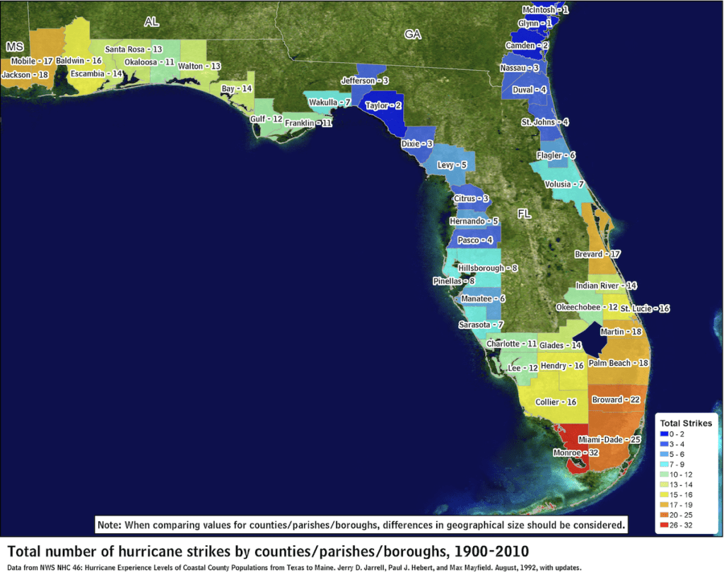 Look at the NOAA map below for the number of hurricane hits since 1900.  Yes, the Mississippi Gulf Coast does have hurricane-prone areas but not as many as other “hot” destinations in the Southeast.