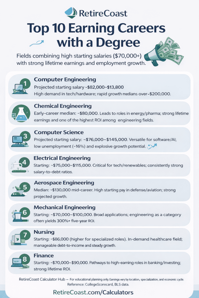 Go to the RetireCoast Calculator Hub →Tip: If you don’t see the tool yet, bookmark the Calculator Hub—new tools are added regularly.