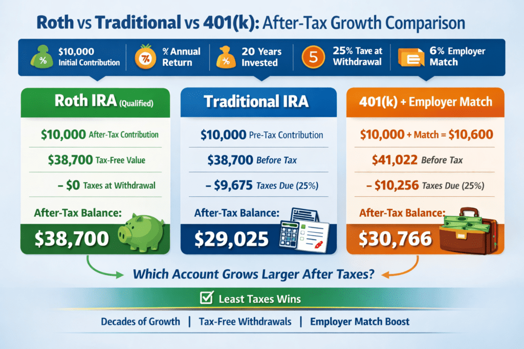Roth vs Traditional vs 401(k): After-Tax Growth Comparison